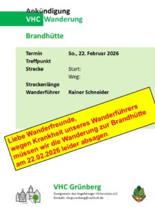 Brandhütte – Lumdatal – Entfällt Die Wanderung am 22.2.26 des VHV Grünberg im Lumdatal zur Brandhütte entfällt wegen Krankheit des Wanderführer. + Zu Google Kalender hinzufügen + iCal / Outlook exportieren 00 Tage 00 Stunden 00 Minuten 00 Sekunden Datum 22 02 26 Uhrzeit 8:00 - 18:00 Kategorie 2025