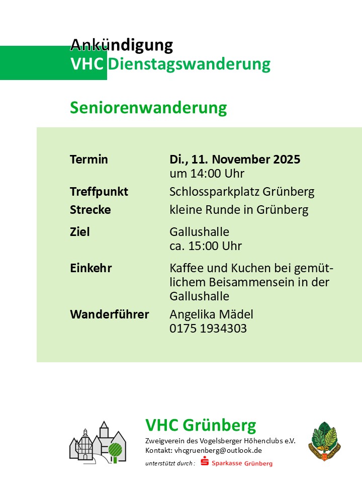 Am Dienstag, den 11.11.25 laufen die Dienstagswanderer eine kleine Runde in Grünberg mit anschließender Einkehr in der Gallushalle bei Kaffee und Kuchen.
