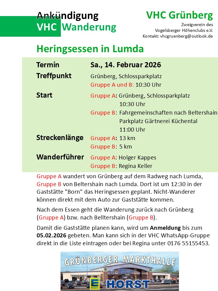 Am Samstag, den 14.2.26 findet unser traditionelles Heringsessen in Lumda in der Gaststätte Born. Es wird in zwei Gruppen gewandert. Details siehe Anhang