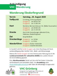 Am Samstag, den 23.8.25 wandert Rainer Schneider und Joachim Breckow zur Landessammelstelle in der Rabenau. Es besteht die seltene Gelegenheit diese Sammelstelle zu besichtigen. Im Anschluss an die Wanderung wir im Hof von Rainer Schneider gegrillt. Anmeldungen bitte über unsere WhatsApp Gruppe oder per E-Mail an vhcgruenberg@outlook.de